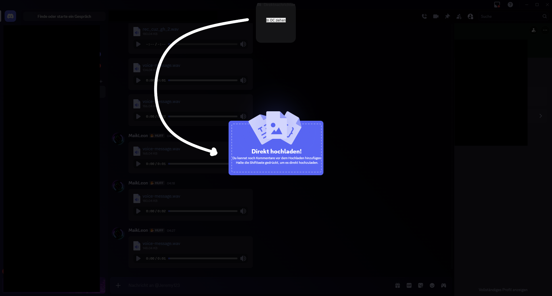 - Nach Beenden erscheint ein Drag‑Feld. Ziehe das Drag‑Feld in ein Discord‑Chatfenster, um die Datei hochzuladen.